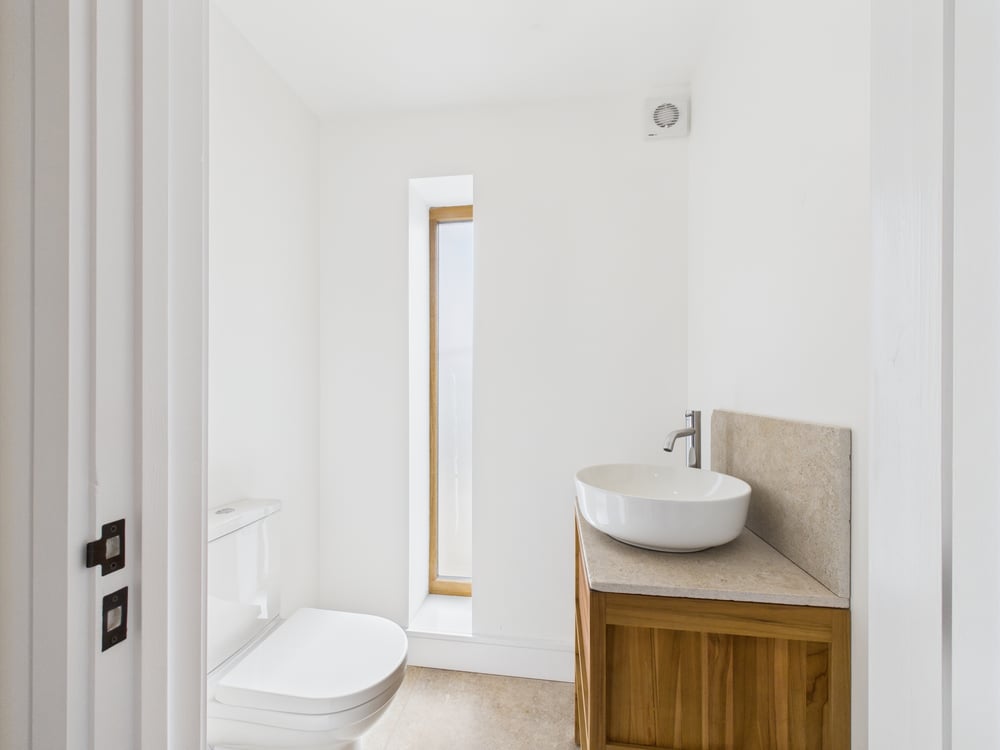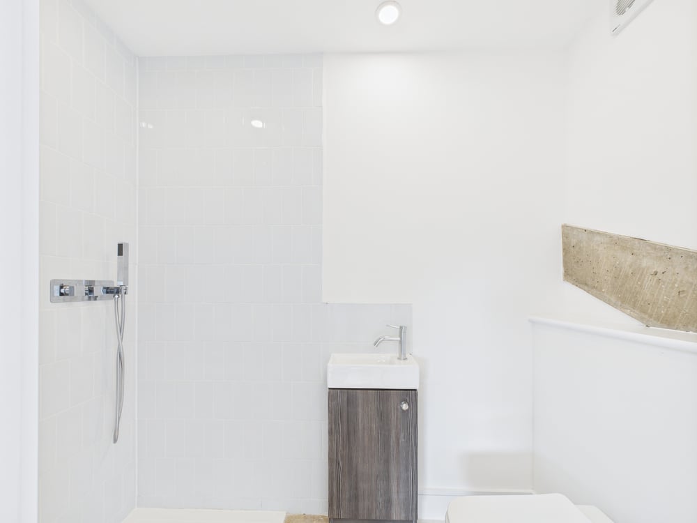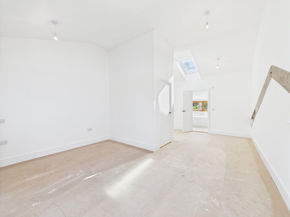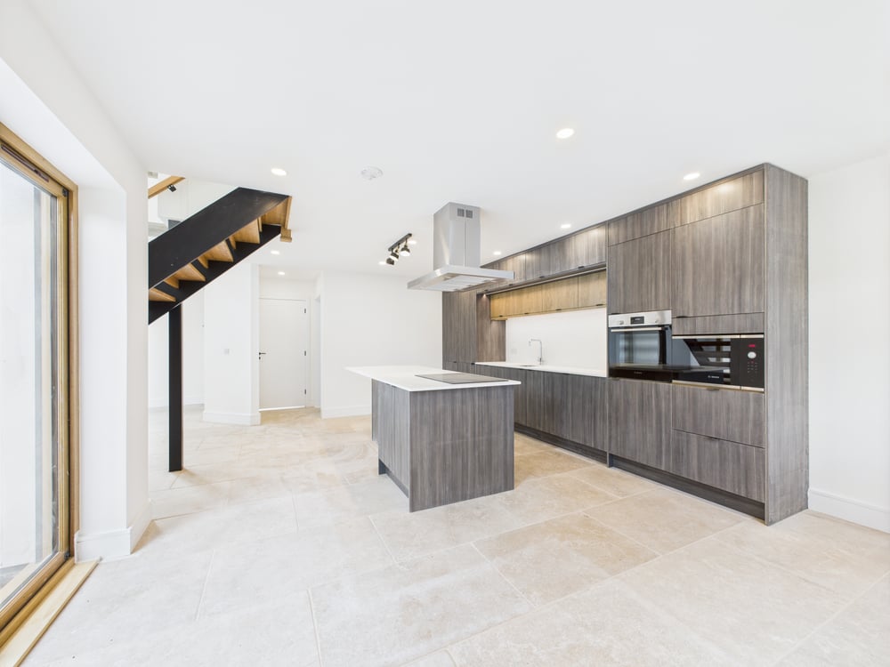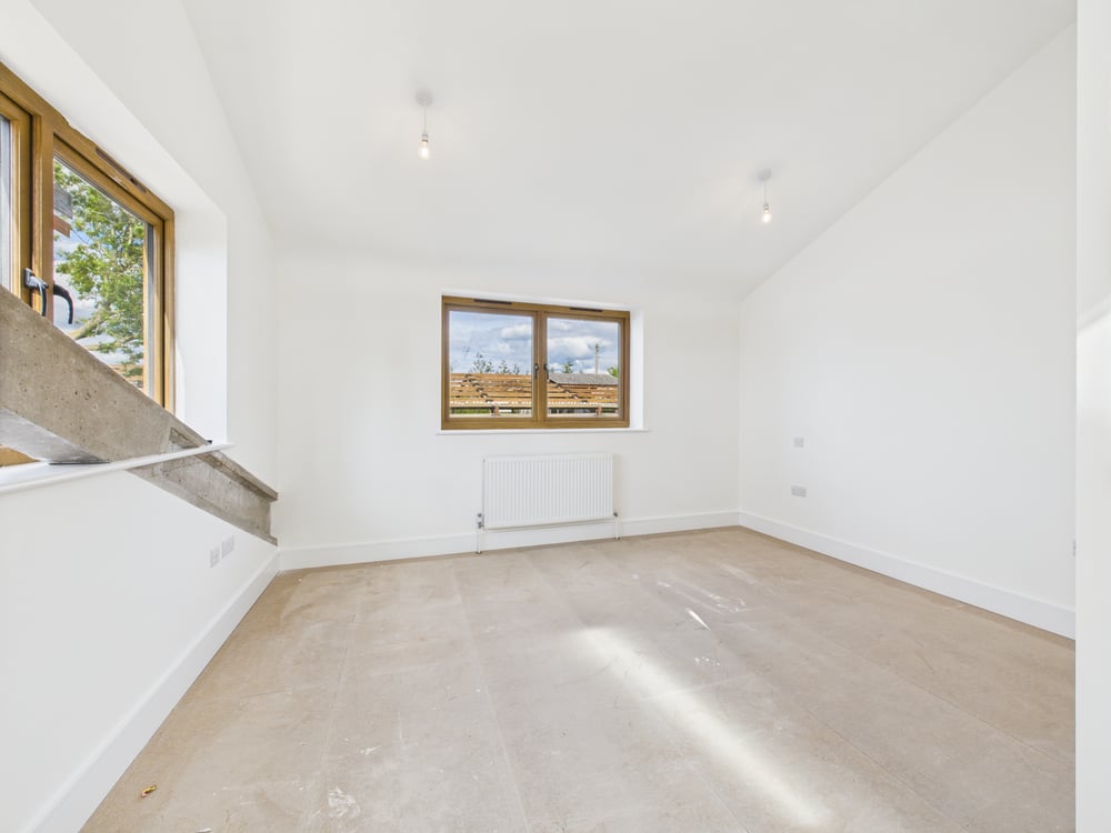 The ground floor showcases a stunning kitchen/breakfast room, fitted with a sleek, contemporary kitchen boasting a range of high-end units and appliances. Timber bi-folding doors open onto a private terrace, seamlessly blending indoor and outdoor living—ideal for entertaining. A utility room and cloakroom offer additional practicality. At the heart of the home, the formal dining room is a masterpiece of design, featuring soaring vaulted ceilings, exposed original concrete beams, and a striking feature window that bathes the space in natural light. A cosy snug/lounge provides a welcoming retreat, while a ground-floor double bedroom with an en-suite shower room offers flexibility and convenience.