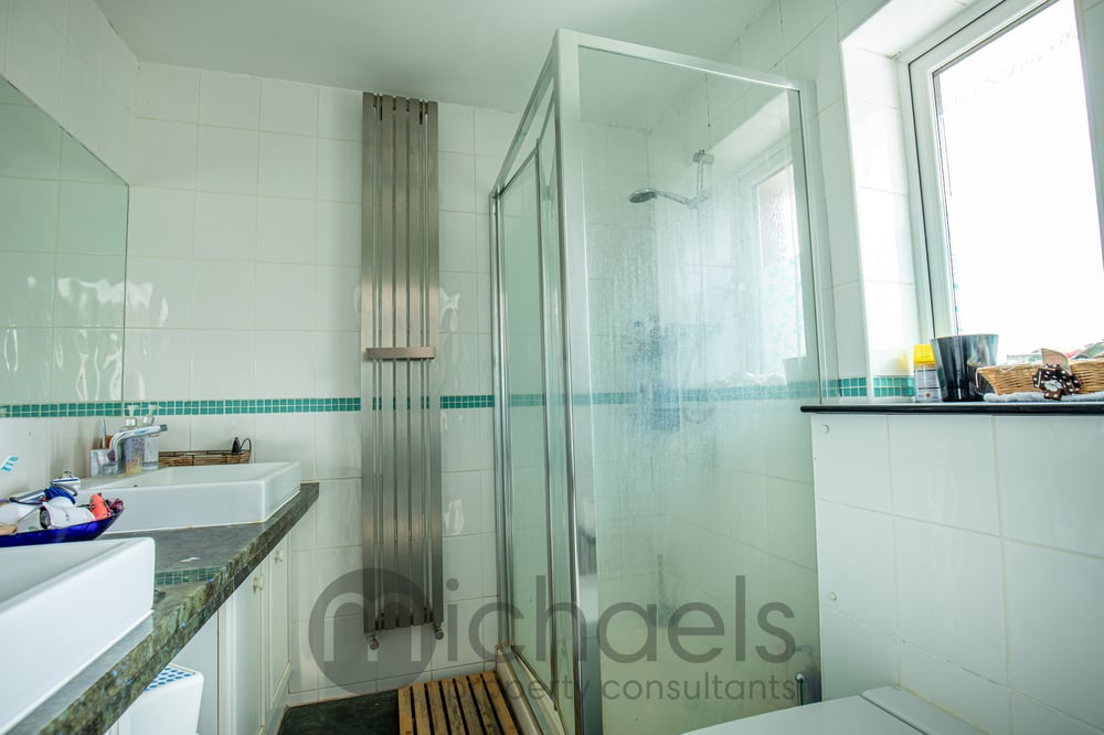 A spacious en-suite comprising of his and hers wash hand basins set into vanity unit, W.C and shower cubicle with UPVC double glazed window to rear, radiator and full tiled walls.