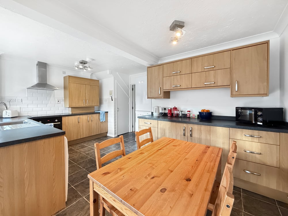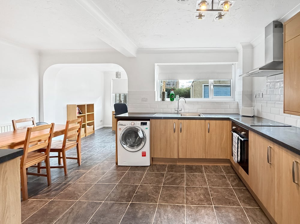 16' x 12' (4.88m x 3.66m) Tiled floor, UPVC window to rear, under stairs storage cupboard, radiator, fitted units and drawers, worktops over, tiled splashbacks, sink and drainer, matching eye level units, spaces and plumbing for appliances, ( washing machine can remain) open plan to