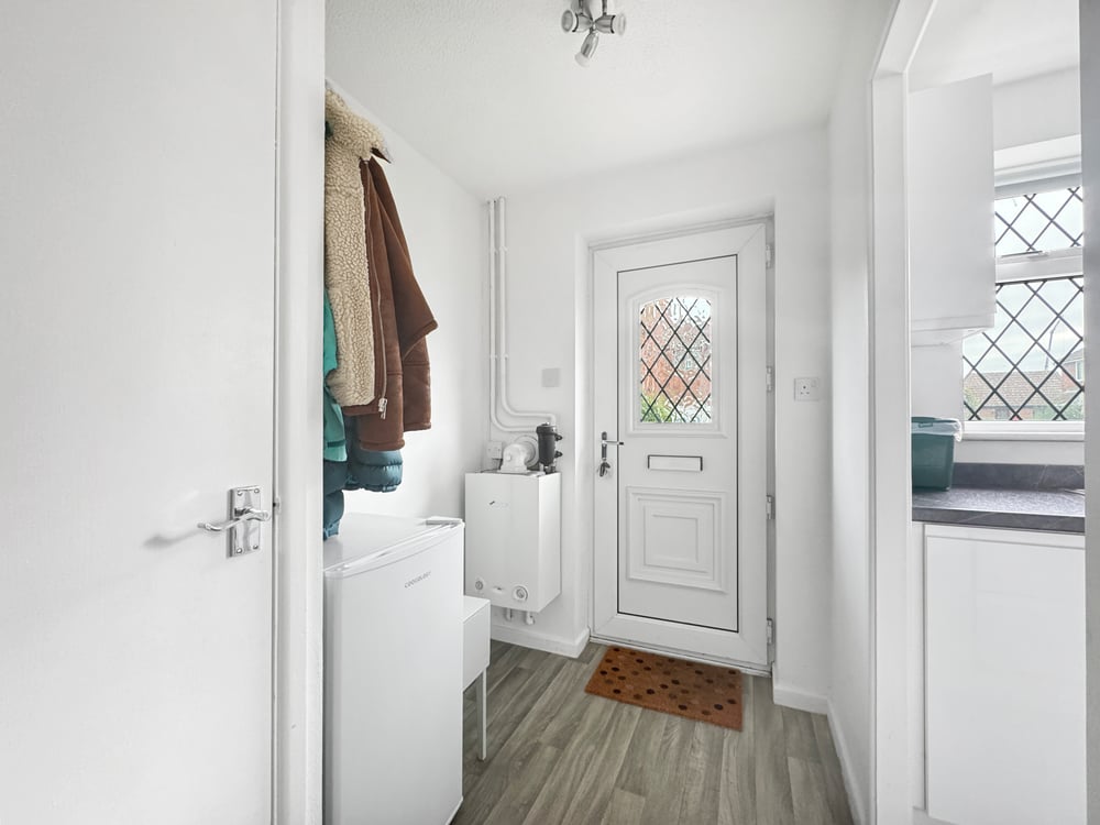 7' 01" x 5' 02" (2.16m x 1.57m) UPVC front door opening onto entrance hall, storage cupboard, wall mounted boiler, doors leading to: