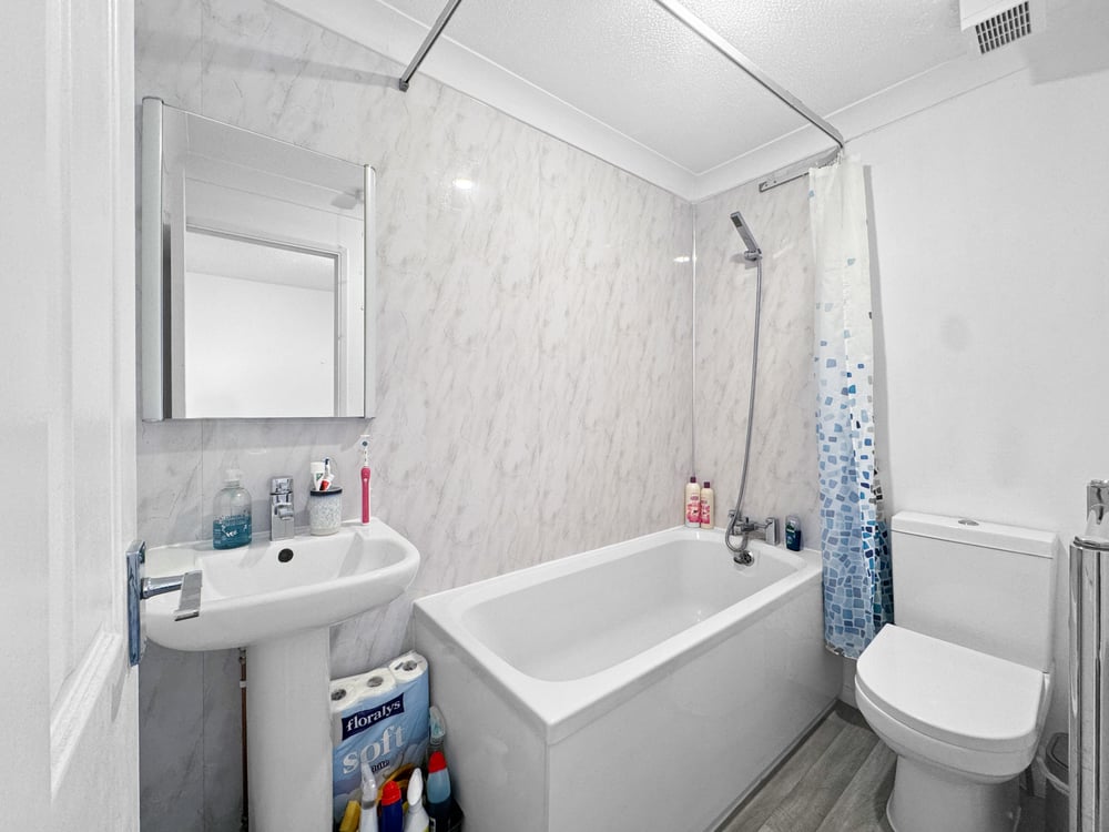 7' 1" x 4' 08" (2.16m x 1.42m) Towel rail, ceiling mounted extractor fan, white bathroom suite including wash hand pedestal basin, panel bath with over head shower, low level WC.