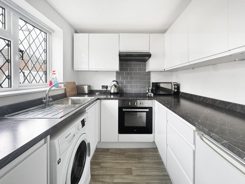 7' 03" x 6' 11" (2.21m x 2.11m) Double glazed window to front, inset spot lights, fitted kitchen with a range of wall and base units, laminate work top, tiled splash back, integrated over head extractor fan, oven, stainless steel sink, space for washing machine and fridge.