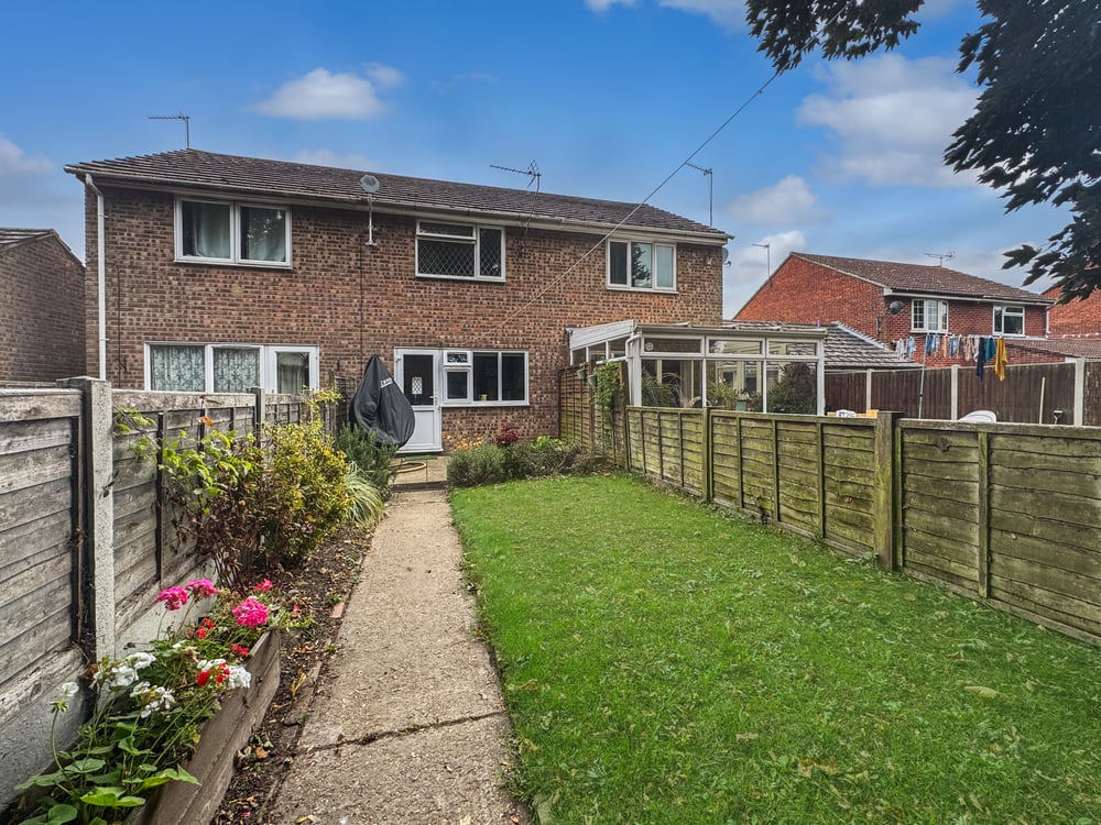Enclosed private rear garden, mainly laid to lawn, hard standing area for shed, rear gate onto foot path, enclosed by fencing.