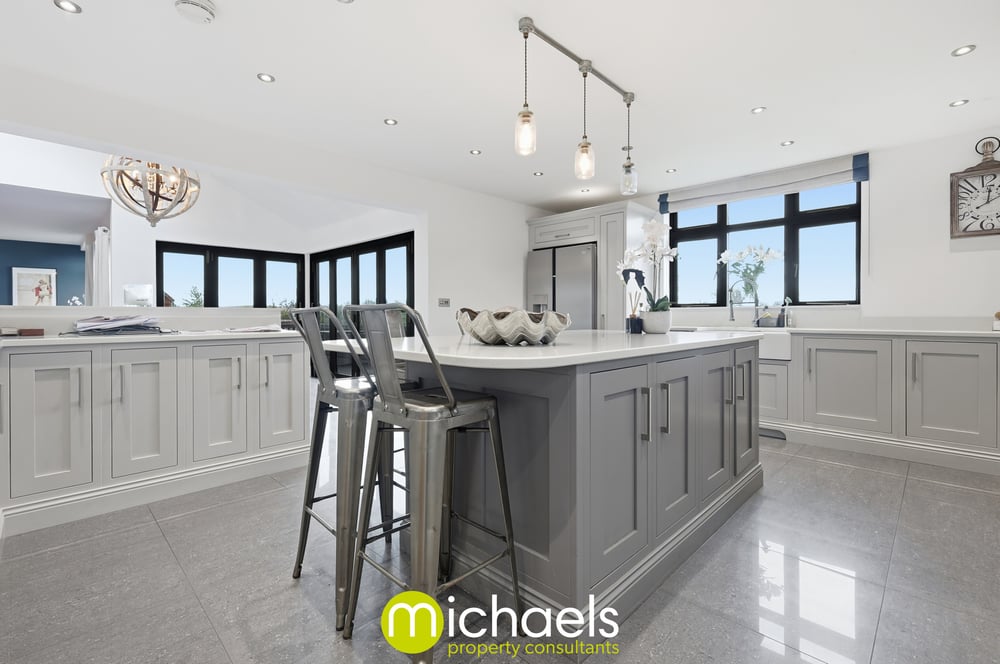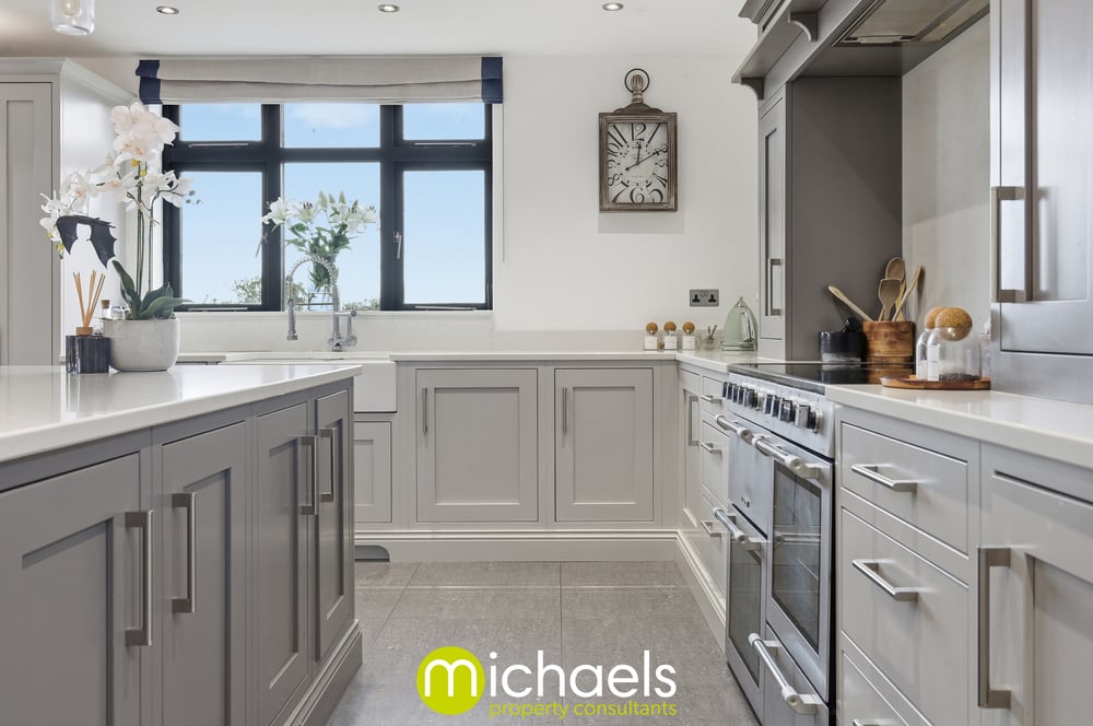 Offering over 3,300 square feet of beautifully presented accommodation, the home welcomes you with a striking vaulted entrance hall that flows seamlessly into a vast open-plan living area. This light-filled space comprises a bespoke kitchen with quartz worktops, a central island, and quality integrated appliances, opening into the dining area and sitting room. Expansive bi-fold doors span the rear of the home, framing uninterrupted views of the surrounding countryside and flooding the space with natural light.