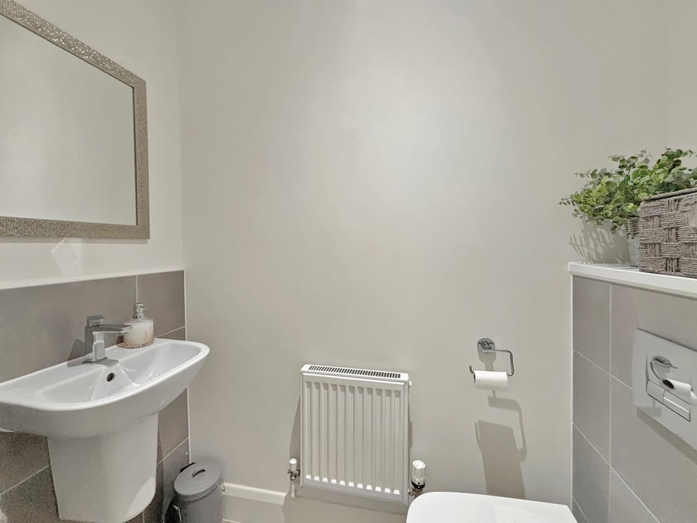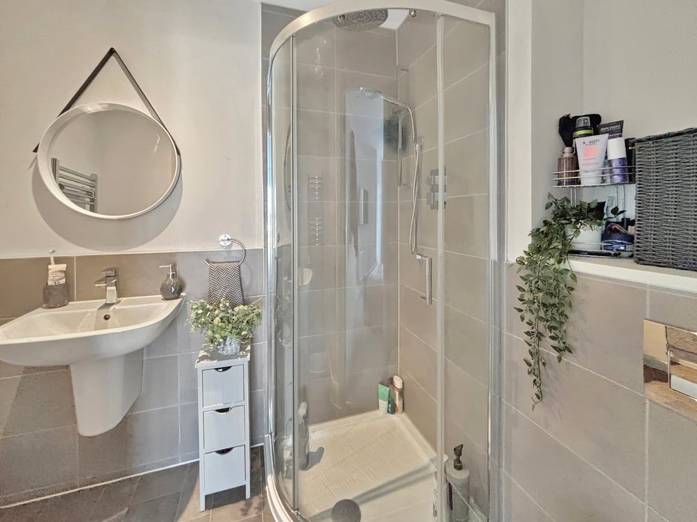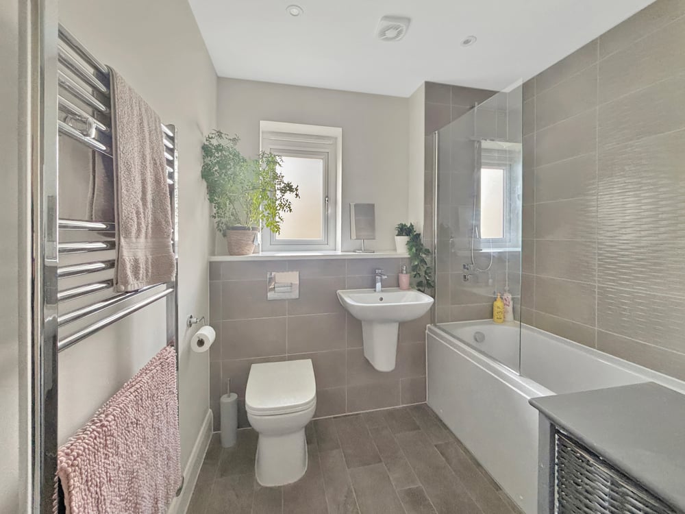 Double glazed obescure window to front, low level WC, wash hand basin, bath with shower over, radiator