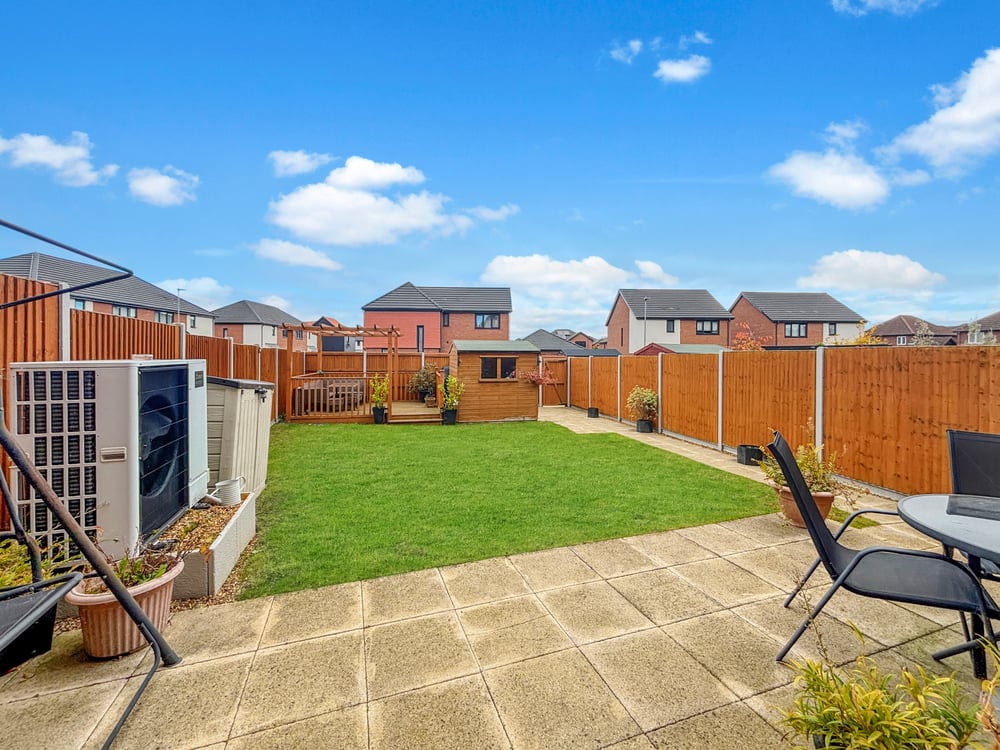 A well maintianed rear garden garden with side access to the front and rear, enclosed by fencing, the garden is laid to lawn, patio and decking area also includes garden shed.