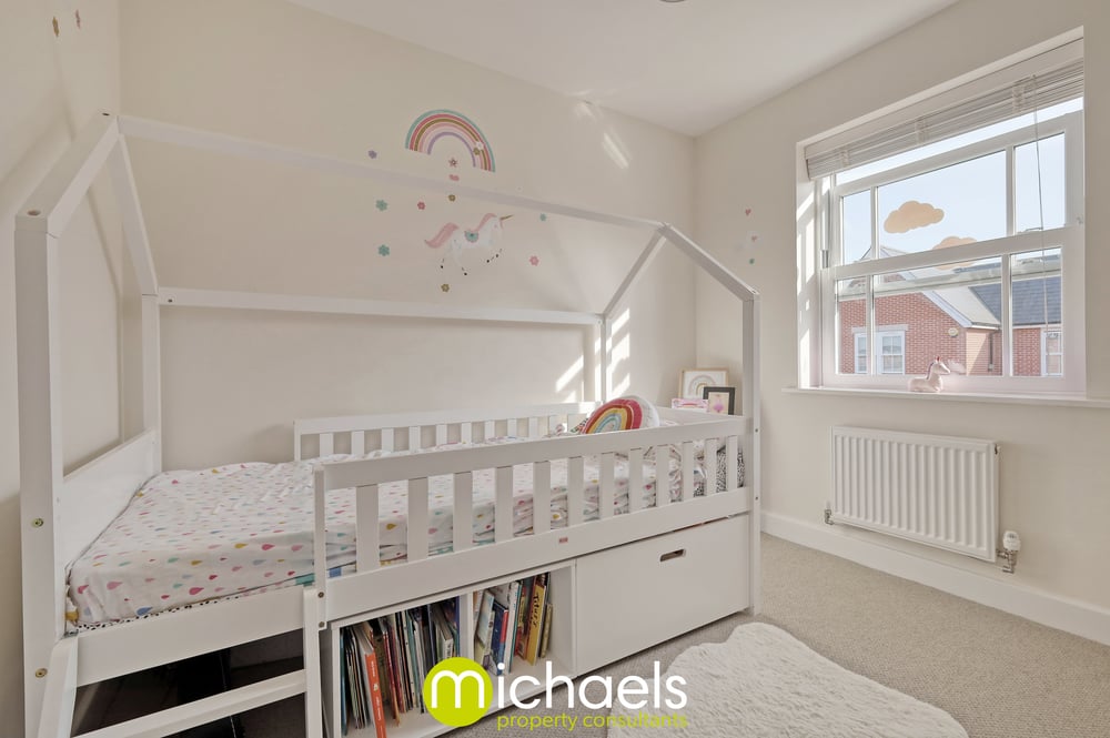 The first floor offers two generous bedrooms, with the principal bedroom benefitting from an en suite shower room, along with a modern family bathroom. The second floor provides two further bedrooms, both with useful inset storage.