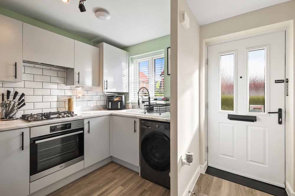 9' 11" x 6' 01" (3.02m x 1.85m) Double glazed window to front, range of wall and base kitchen units, celling extractor fan, laminate worktop, integrated gas hob, cooker and cooker hood, inset sink with left hand drainer, space for washing machine and dish washer and firdge/freezer/