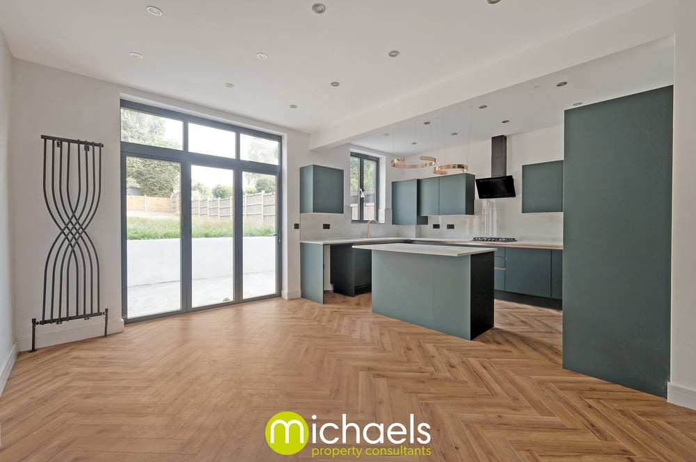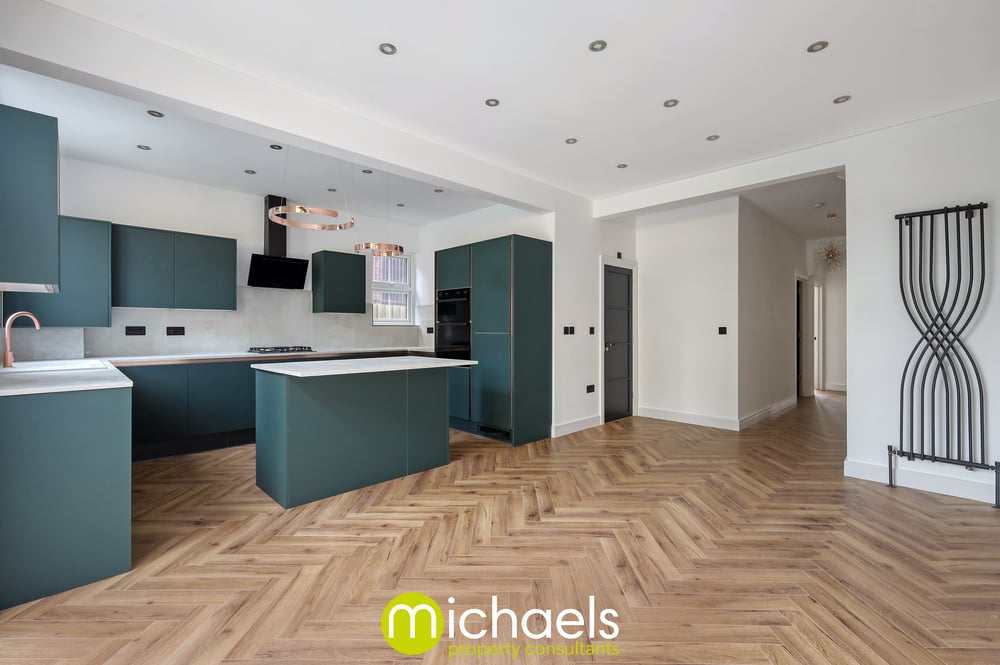 Internally, the home opens with a striking entrance hall featuring a glass balustrade staircase, vertical radiator, and herringbone flooring. Glazed internal doors provide an abundance of natural light and lead to a spacious reception room with bay window and original fireplace. A formal dining room offers further entertaining space, while the standout feature is the expansive kitchen/dining/family room with oversized bi-folding doors leading to the garden. The kitchen is finished to an exceptional standard with integrated appliances, tiled splashbacks, stone work surfaces, a central island with breakfast bar, and inset spotlights. A luxury ground floor shower room completes the downstairs.