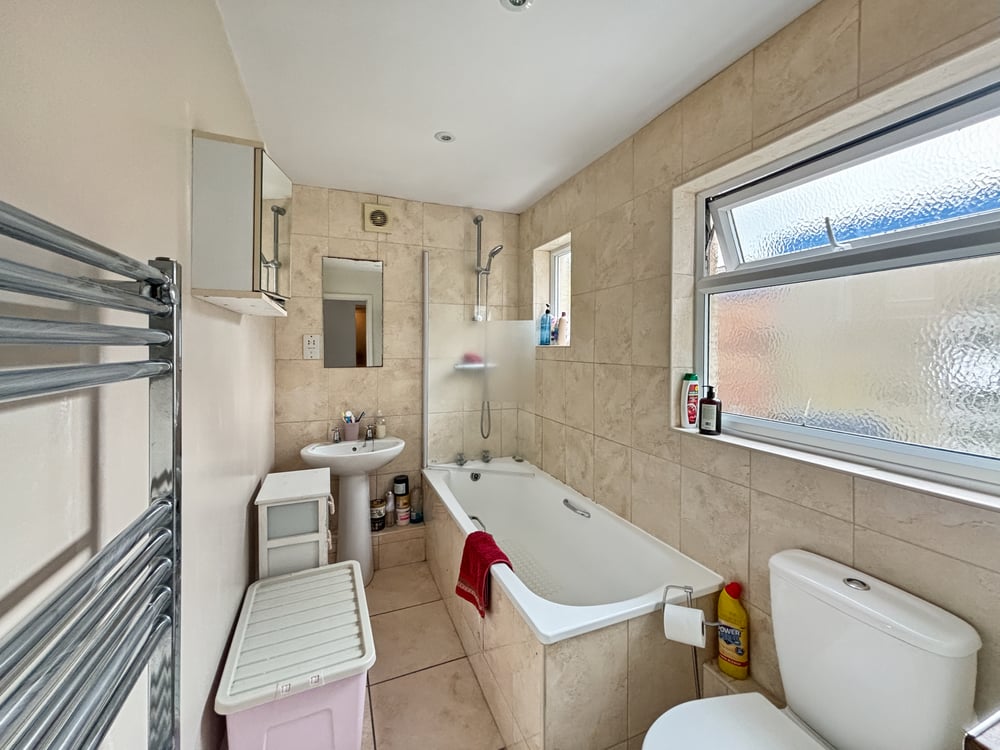 With double glazed window to side, three piece suite consisting of close coupled WC, pedestal wash hand basin, panelled bath with shower over, tiled splashbacks.