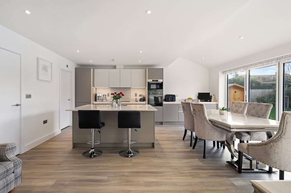 23' 0" x 18' 6" (7.01m x 5.64m) Bi-Fold doors to rear, radiator, twin doors to sitting room, door to utility room, a contemporary range of fitted units and drawers with stone worktops over, inset induction hob, double oven, extractor, integrated fridge, central island with overhang for barstools, inset sink and dishwasher.