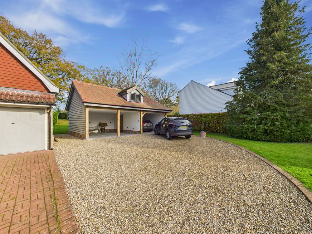 The gardens extend to approximately 1.5 acres (STS) and are accessed via double gates opening onto a substantial block-paved driveway, which continues through to the detached double garage. A separate shingled driveway leads to the cart-lodges, while the remainder of the grounds are predominantly laid to lawn.