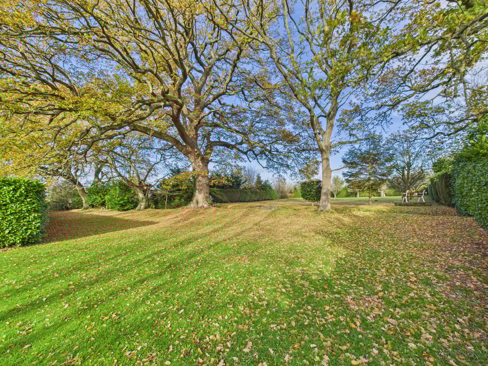 The rear garden begins with a spacious patio terrace ideal for outdoor seating and entertaining, followed by an extensive lawn framed by mature trees and established shrubs. Beyond this lies the paddock, also laid mainly to lawn, offering both excellent privacy and attractive open views. An oil tank is situated discreetly within the grounds.