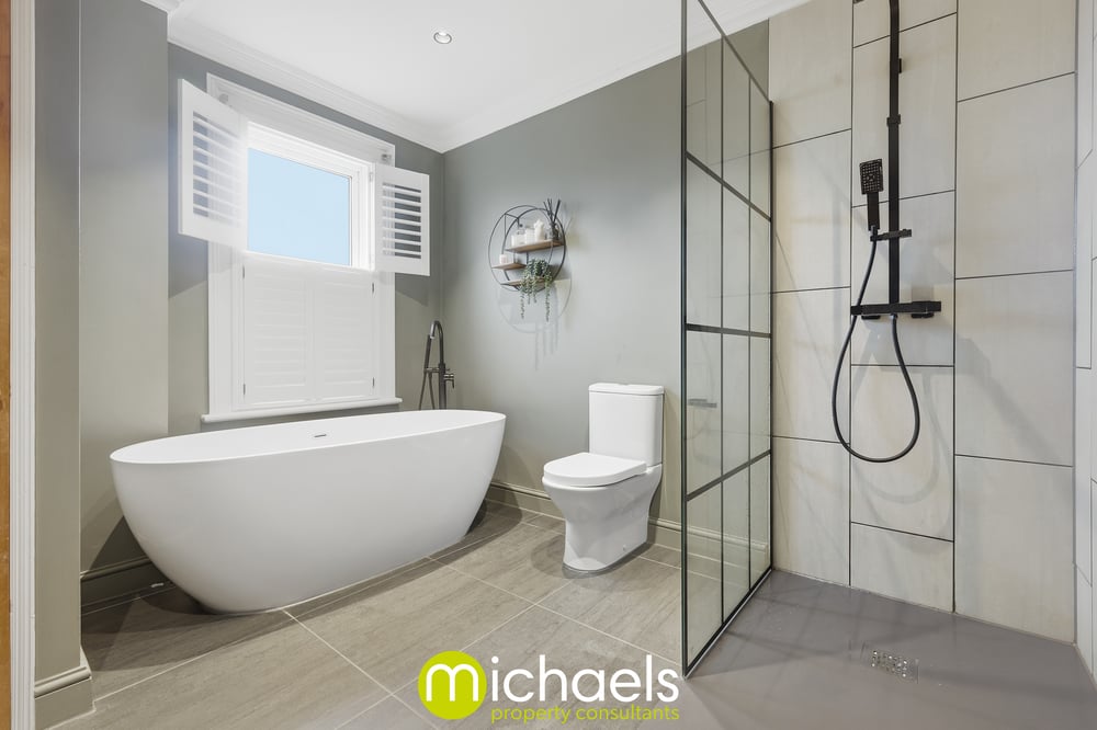 The first floor provides generous and flexible reception space, including three well-proportioned double bedrooms. The master bedroom enjoys its own en-suite shower room, while the luxury four-piece family bathroom features a free-standing bath, walk-in shower, vanity basin, and stylish contrasting black finishes.