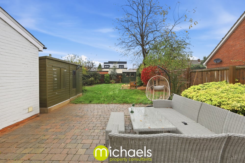 Externally, the property benefits from off-road parking to the front via a private driveway, with the house set back and screened by a low hedgerow for added privacy. The rear garden is private and enclosed, offering secure gated side access, a block-paved patio ideal for al fresco dining, a large lawned area, mature hedges, shrubs, trees, and multiple storage options including a sizeable shed and an additional storage unit to the rear.