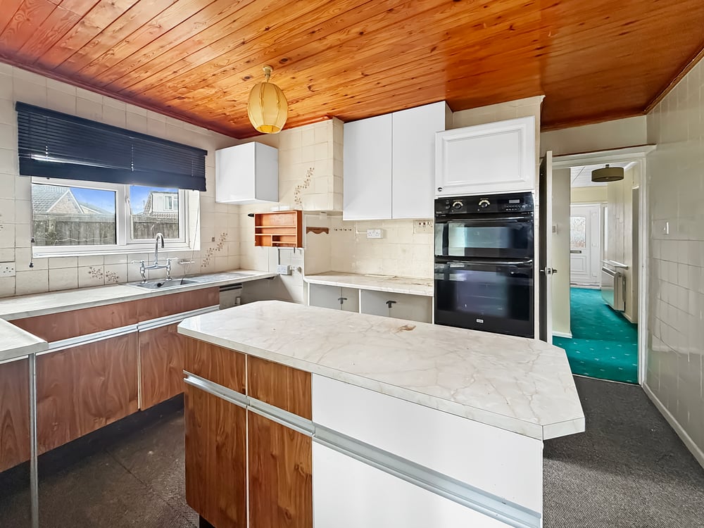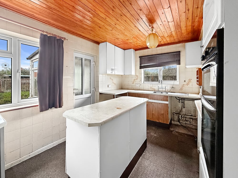 12' 0" x 9' 07" (3.66m x 2.92m) Double glazed window to side and door to rear, range of wall and base units, steel sink right hand drainer, space for oven, fridge/freezer and washing machine.