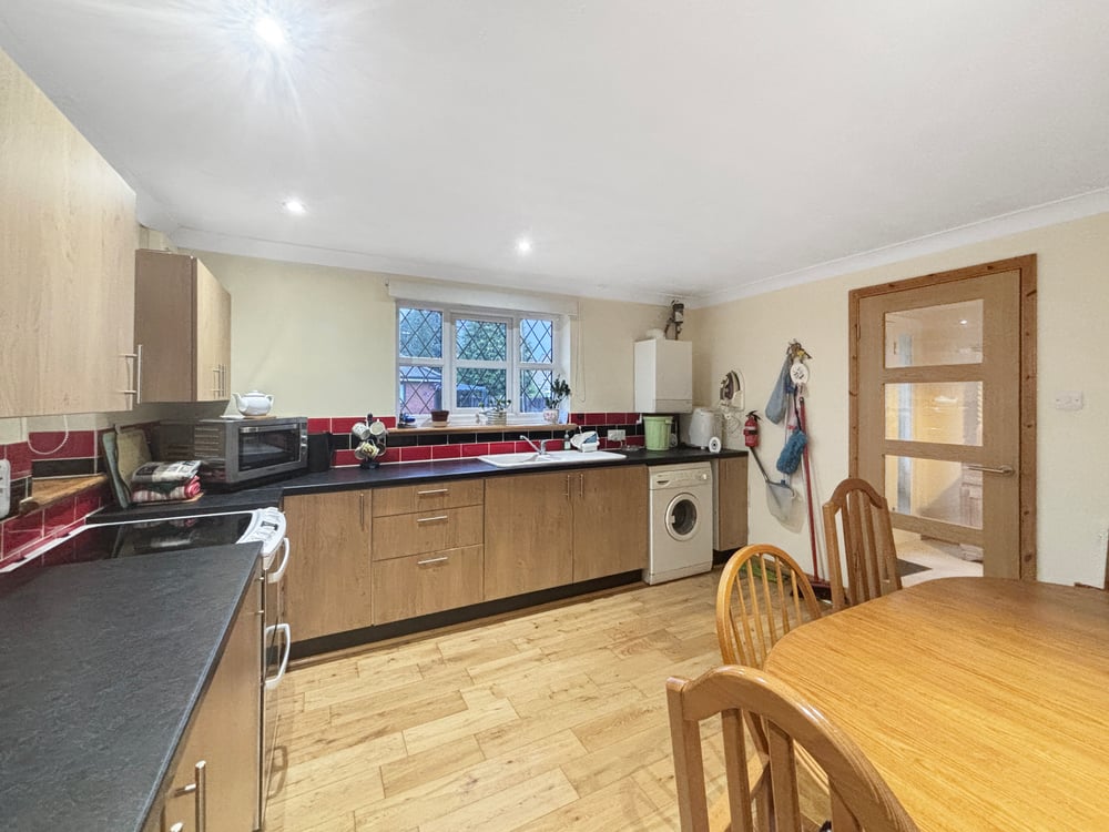 12' 6" x 12' 0" (3.81m x 3.66m) Window to front and side, Inset spot lights, radiator, range of wall and base units, laminate worktop, space cooker, washing machine, inset sink, wall mounted boiler, open plan onto Dining area.