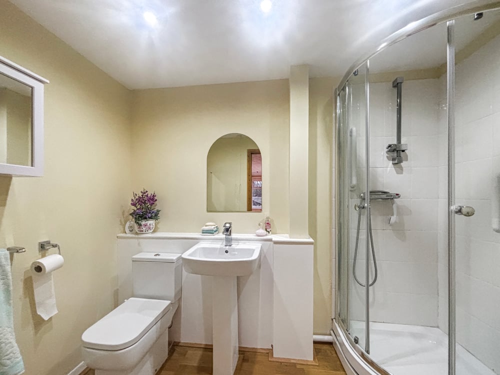 Inset spot lights, radiator, corner shower encloser, low level WC, wash hand basin.