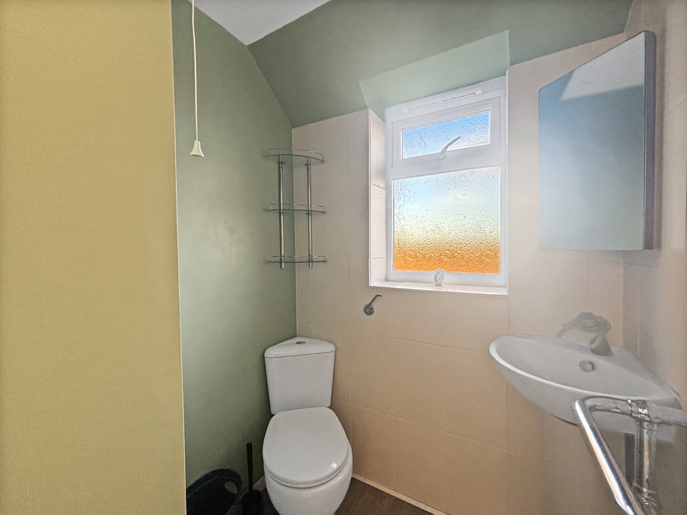 Obscure window to rear, radiator, panel bath, low level WC, wash hand basin, tiled splashbacks.