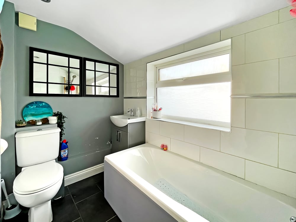 Obscure window to side, panel bath, close coupled WC, vanity wash hand basin, tiled floor, half tiled walls.