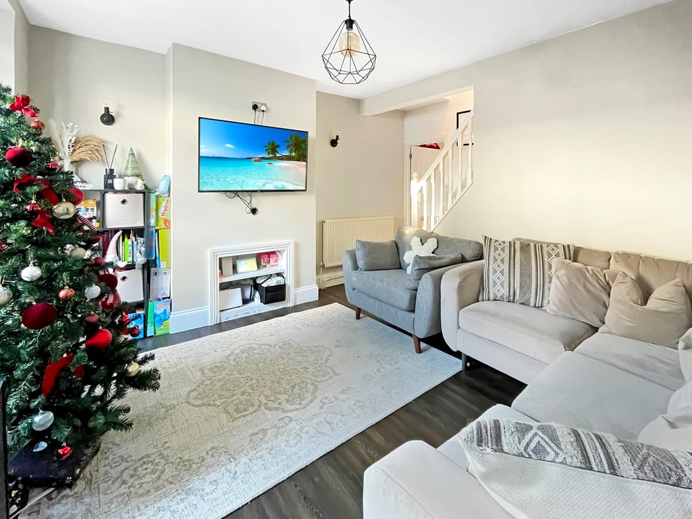15' 11" x 12' 4" (4.85m x 3.76m) Bay window to front, radiator, wood effect flooring, stairs to first floor.