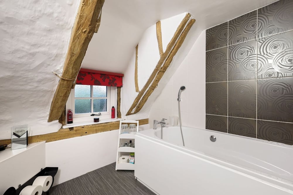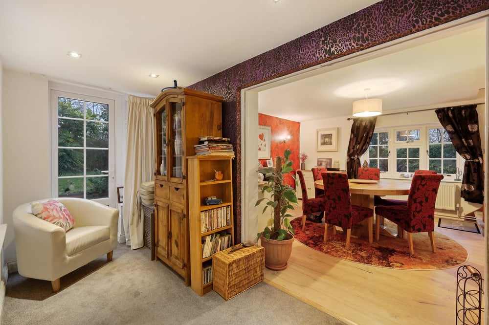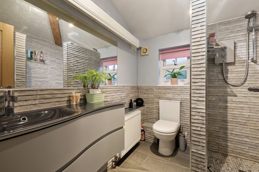 The ground floor comprises a welcoming rear reception hall, a spacious sitting room with an impressive inglenook fireplace and French doors opening onto the rear garden, a front porch, a well-appointed country-style kitchen/breakfast room, a utility room, a recently refitted shower room, and a formal dining room. The layout offers excellent versatility, with three well-proportioned reception rooms providing ample space for both everyday living and entertaining.
