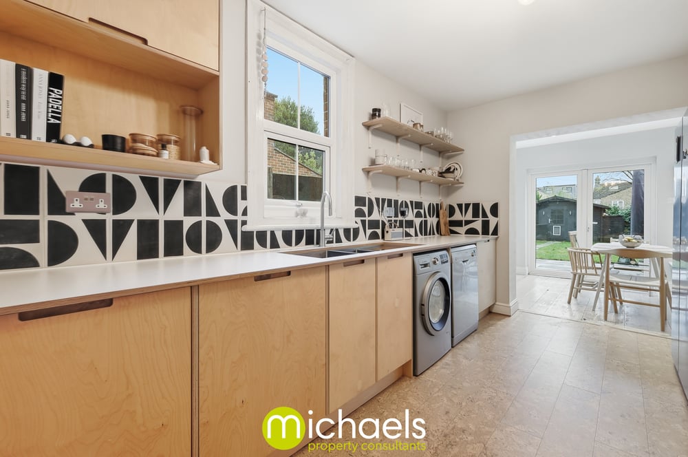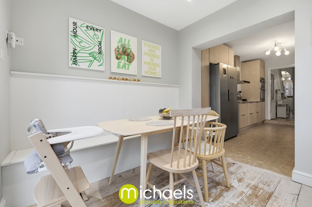 The bespoke fitted kitchen offers an excellent range of storage, complemented by patterned tiled splashback and space and plumbing for appliances. To the rear, a further breakfast/dining area enjoys garden views and opens onto the private, enclosed rear garden via double doors.