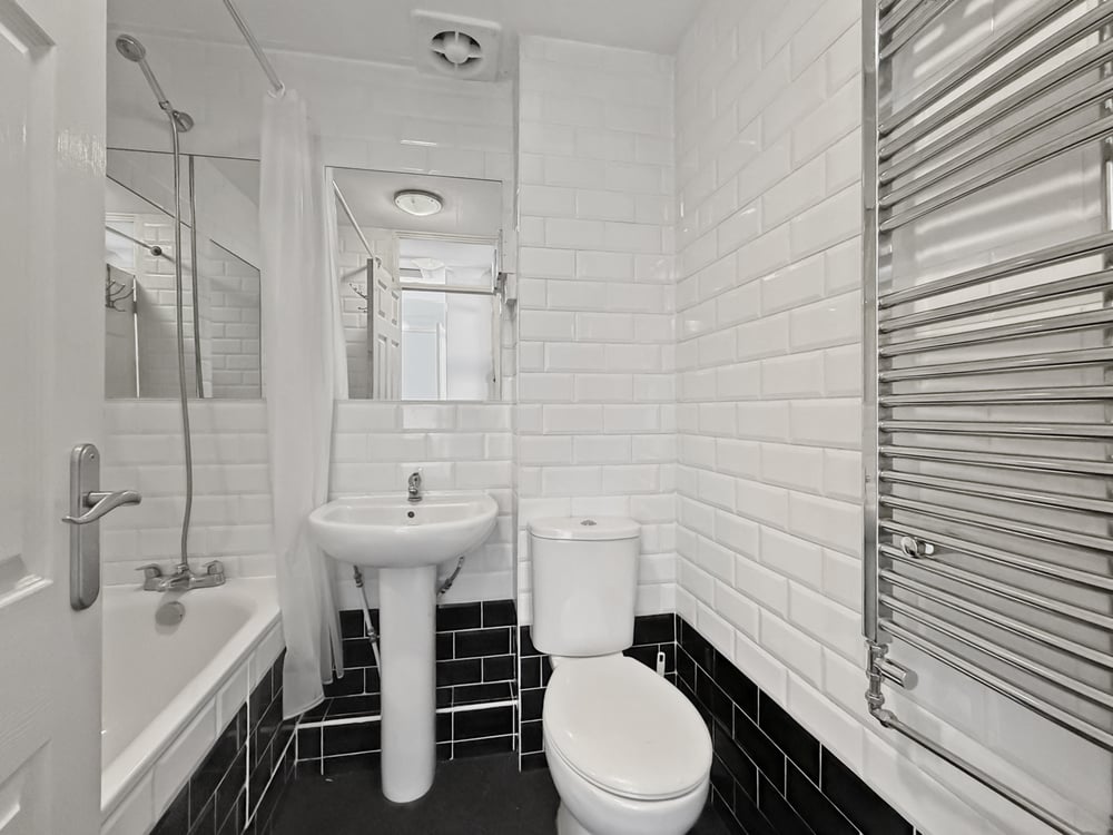 Tiled floor and walls, towel radiator, celling fan, wash hand basin, paneled bath WC.