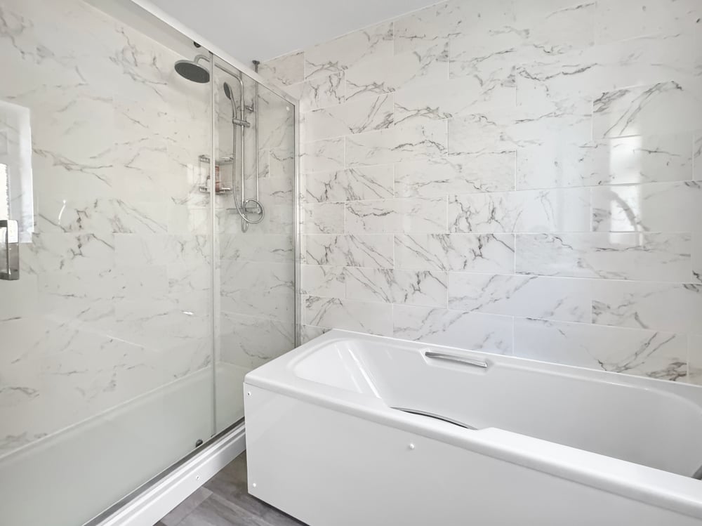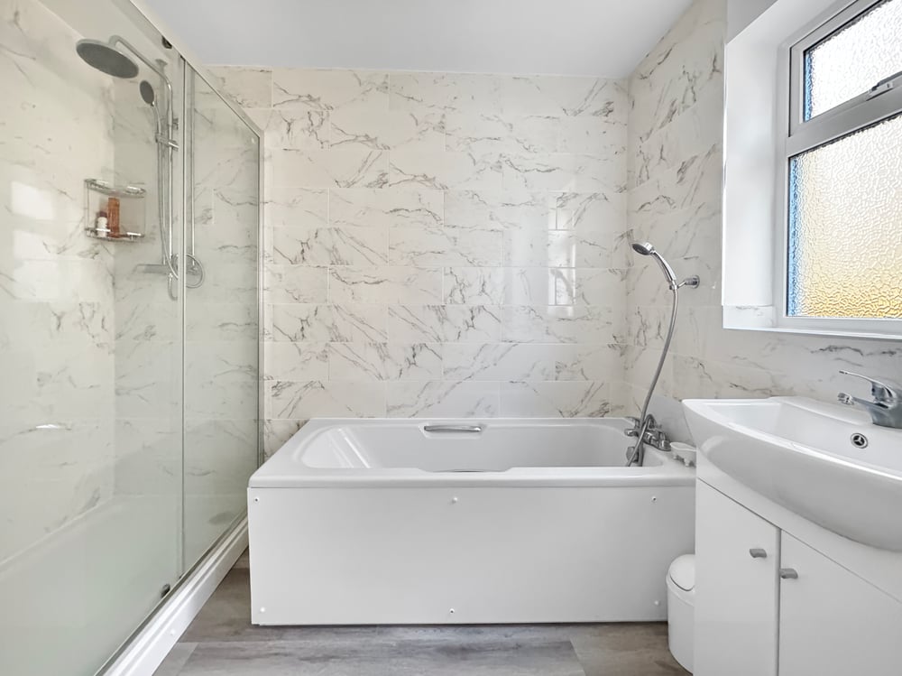 Two obscure windows to side, large shower cubicle, fitted bath, vanity wash hand basin with storage, close coupled WC, tiled walls, heated towel rail.