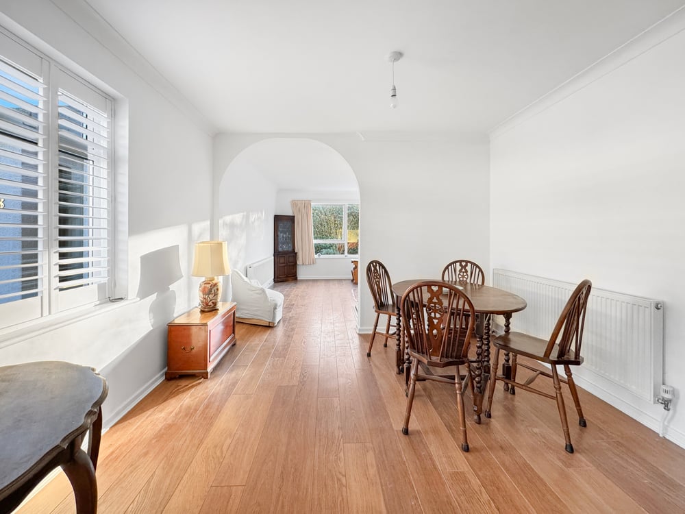 11' 2" x 10' 5" (3.40m x 3.17m) Wood flooring, window to side with shutters, radiator, open plan to living room.