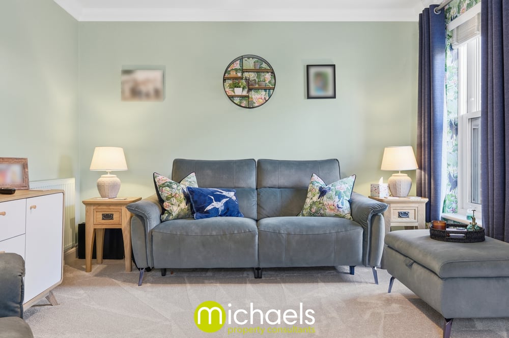 The property welcomes you with a bright entrance hall, complete with a downstairs cloakroom. The heart of the home is the stylish kitchen/diner, featuring shaker-style units, contrasting LVT flooring, space for appliances, and direct access to the low-maintenance landscaped rear garden. A well-proportioned living room benefits from dual-aspect windows, creating a light and airy living space.