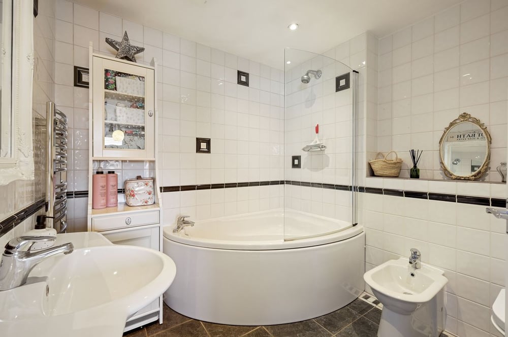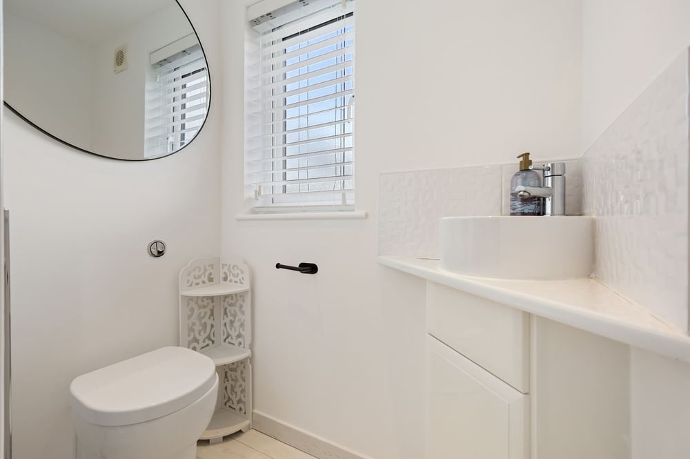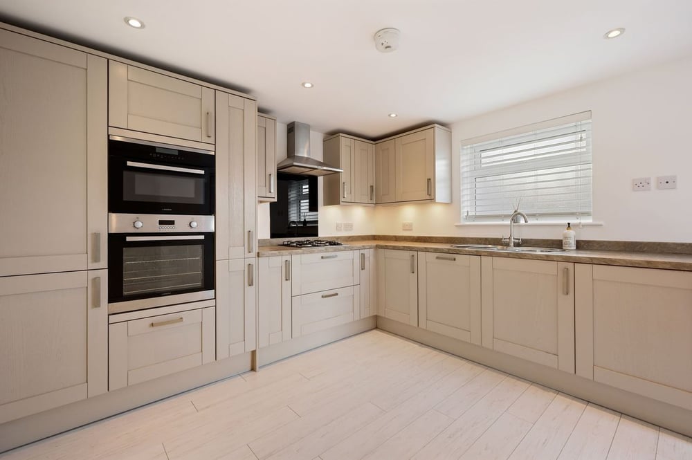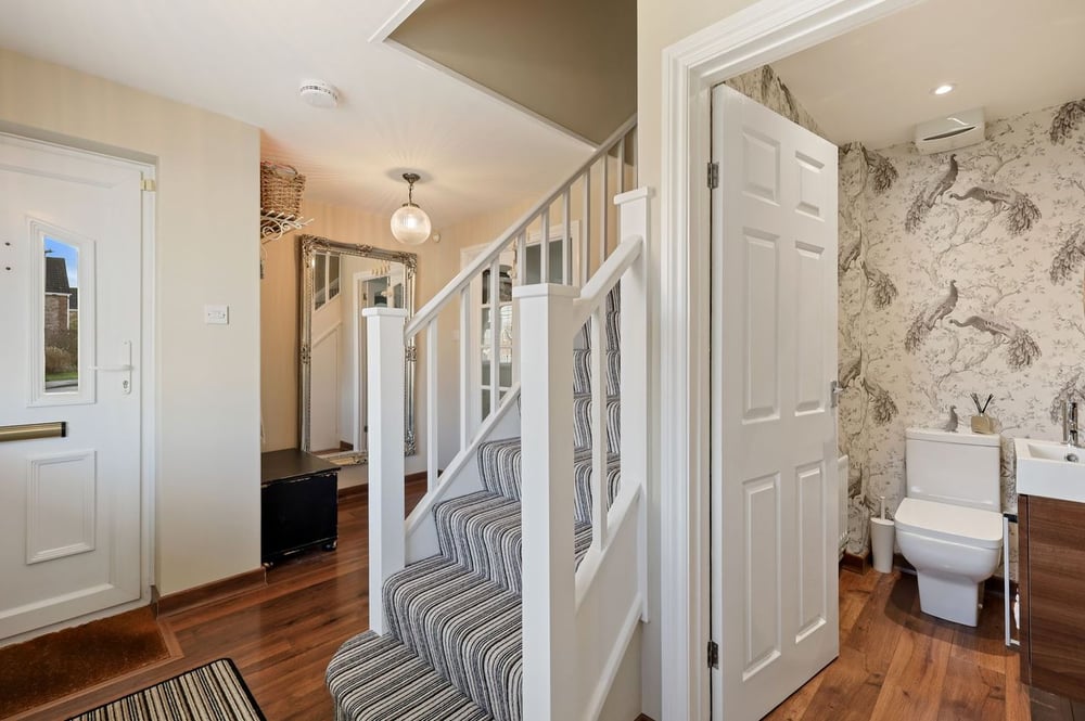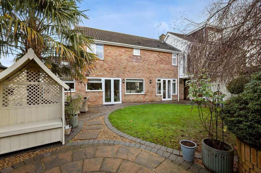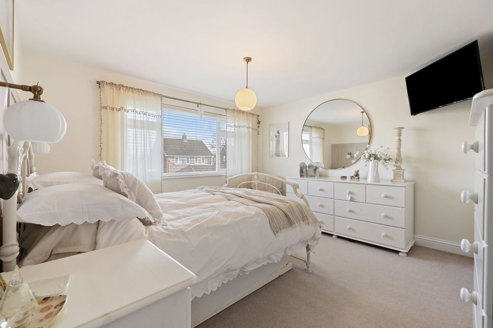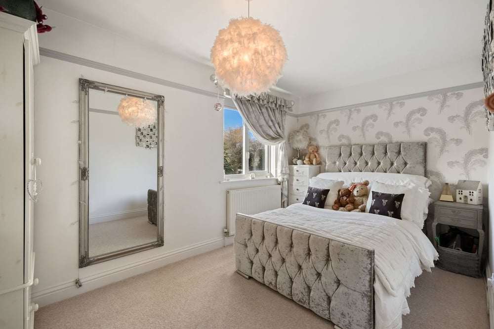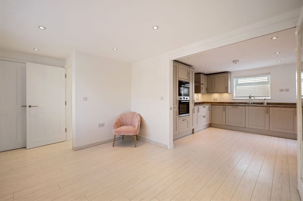To the first floor, the principal bedroom benefits from a walk-in wardrobe and en suite bathroom. The second bedroom also enjoys its own en suite shower room, alongside two further well-proportioned bedrooms and a contemporary family bathroom.