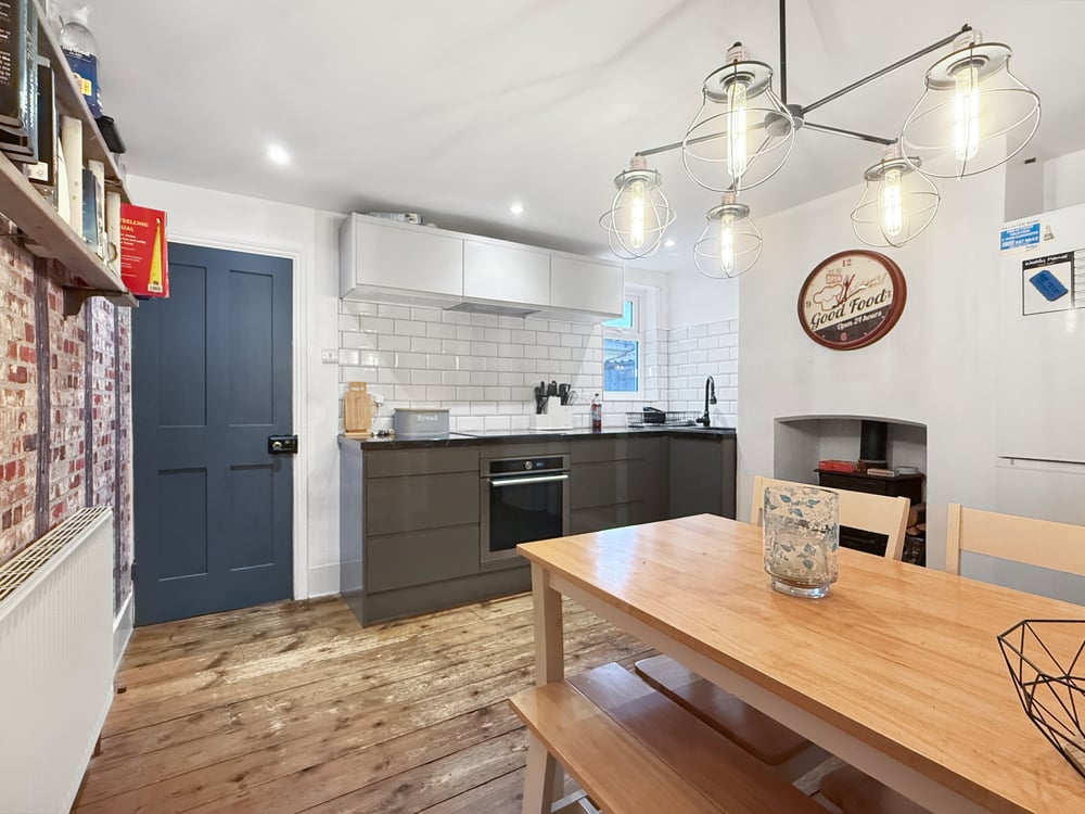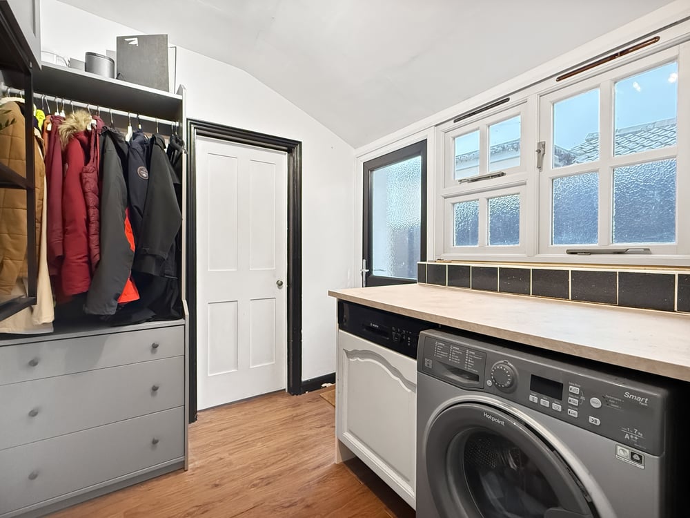 The accommodation comprises a cosy living room highlighted by a cast-iron fireplace, a spacious kitchen/diner fitted with sleek high-gloss units, a separate utility room with access to the rear garden, a family bathroom, and two well-proportioned double bedrooms.
