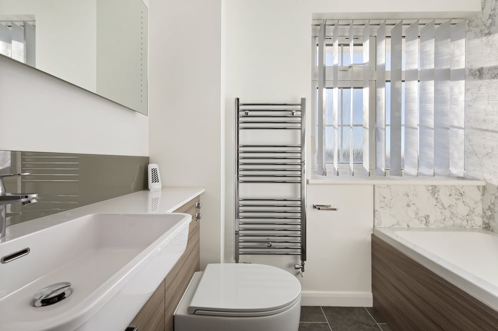 Panel bath with shower screen, vanity wash hand basin, vanity WC, heated towel rail.