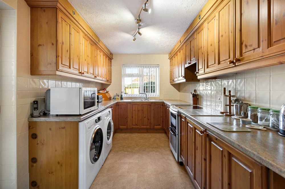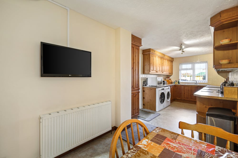 24' 7" x 8' 9" (7.49m x 2.67m) Window to rear, window to side, door to garden, a range of fitted units and drawers with worktops over, inset sink and drainer, space for oven, space for washing machine, space for tumble dryer, space for cooker, dishwasher, fridge, freezer, matching eye level units, tiled splashbacks, radiator, ample space for dining table.