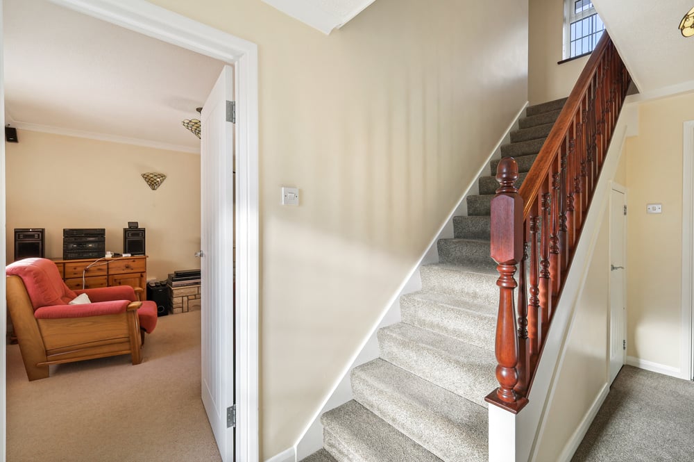 14' 1" x 7' 0" (4.29m x 2.13m) Stairs to first floor with cupboard under, radiator and doors to.