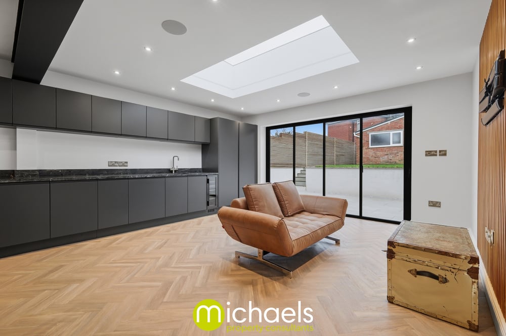 To the rear of the home lies the focal point of the property: an impressive extended kitchen, dining, and entertaining space. Finished to a high specification, this space features granite worktops, LVT flooring, and a full range of integrated AEG appliances including a microwave, single oven, induction hob with extractor, dishwasher, integrated fridge, and separate integrated freezer. Additional highlights include a boiling water tap, wine fridge, and built-in Lithe Audio Bluetooth ceiling speakers. Bi-folding doors and a large roof light flood the room with natural light and provide seamless access to the garden. A separate utility room offers additional storage and plumbing for appliances.