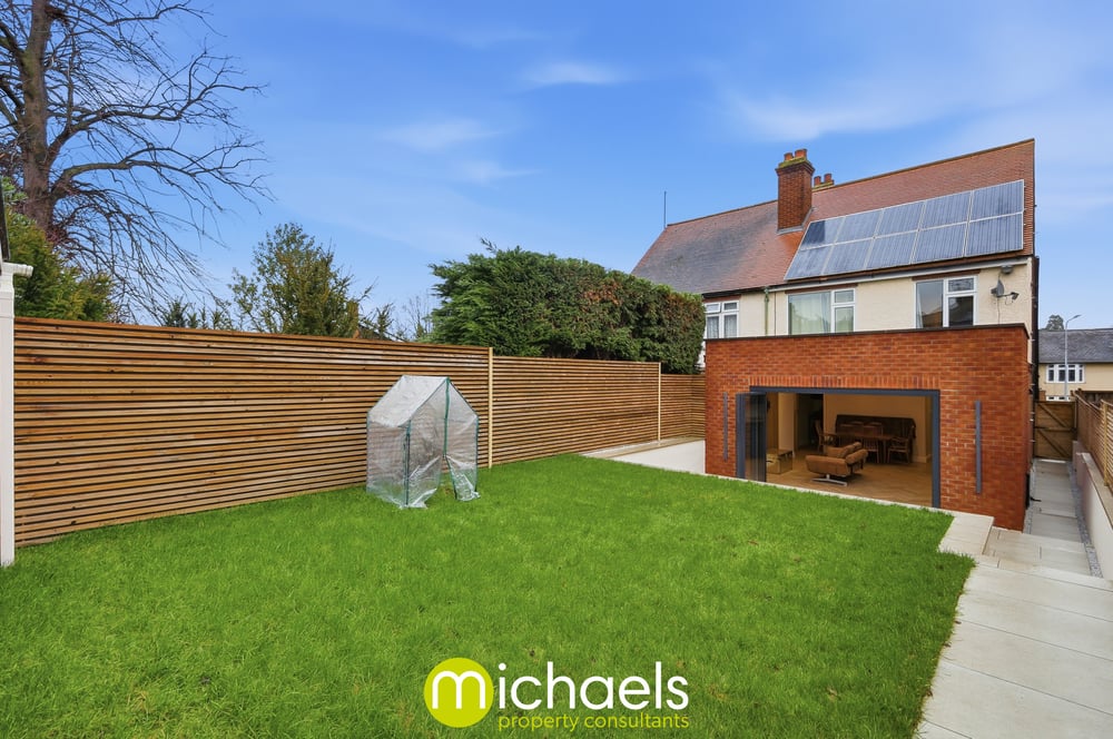 The south-west facing rear garden has been landscaped to a high specification, featuring porcelain tiled seating areas and a split-level design with a raised lawn. Practical features include side access, an external tap, and a rear gate providing access next to the garage.