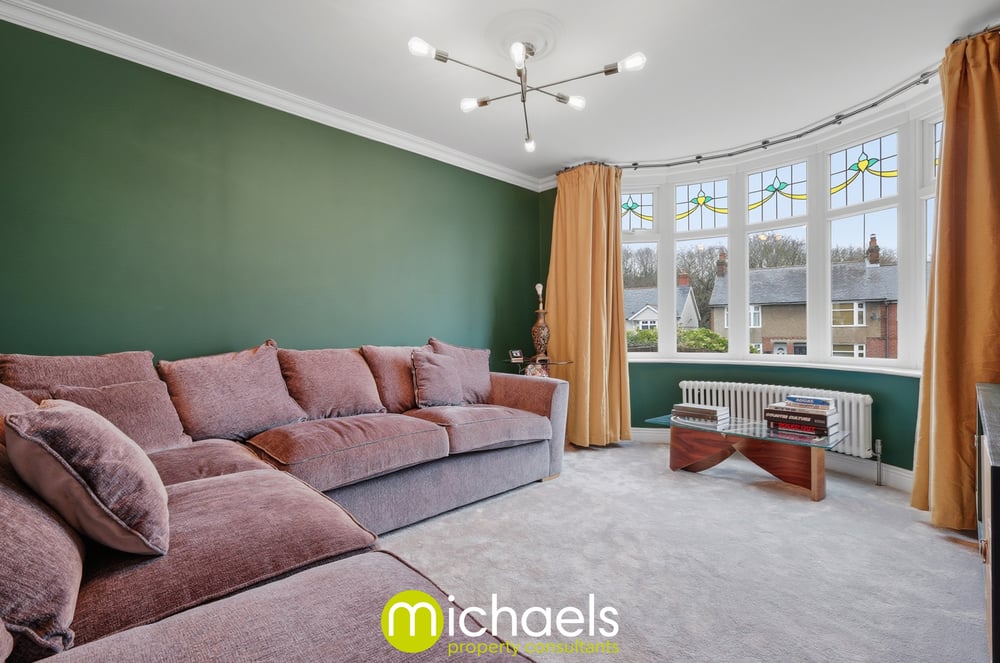 The formal reception room is warm and inviting, centred around a handsome bay window featuring a striking stained-glass detail. A column radiator beneath the bay enhances the period feel, making this an ideal space for relaxing or entertaining.