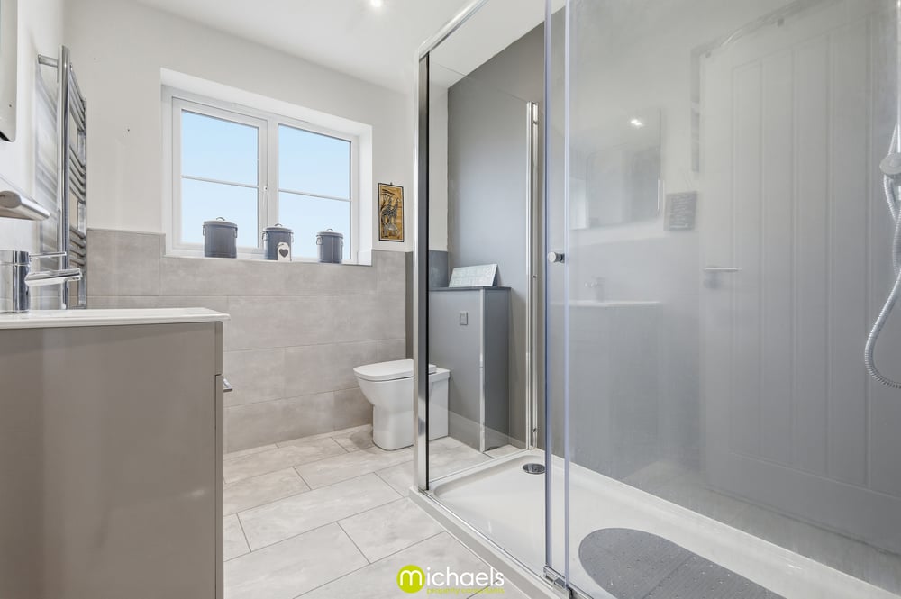 Walk in shower, enclosed cistern WC, vanity wash hand basin, heated towel rail, tiled floor, Obscure window to rear, half tiled walls.