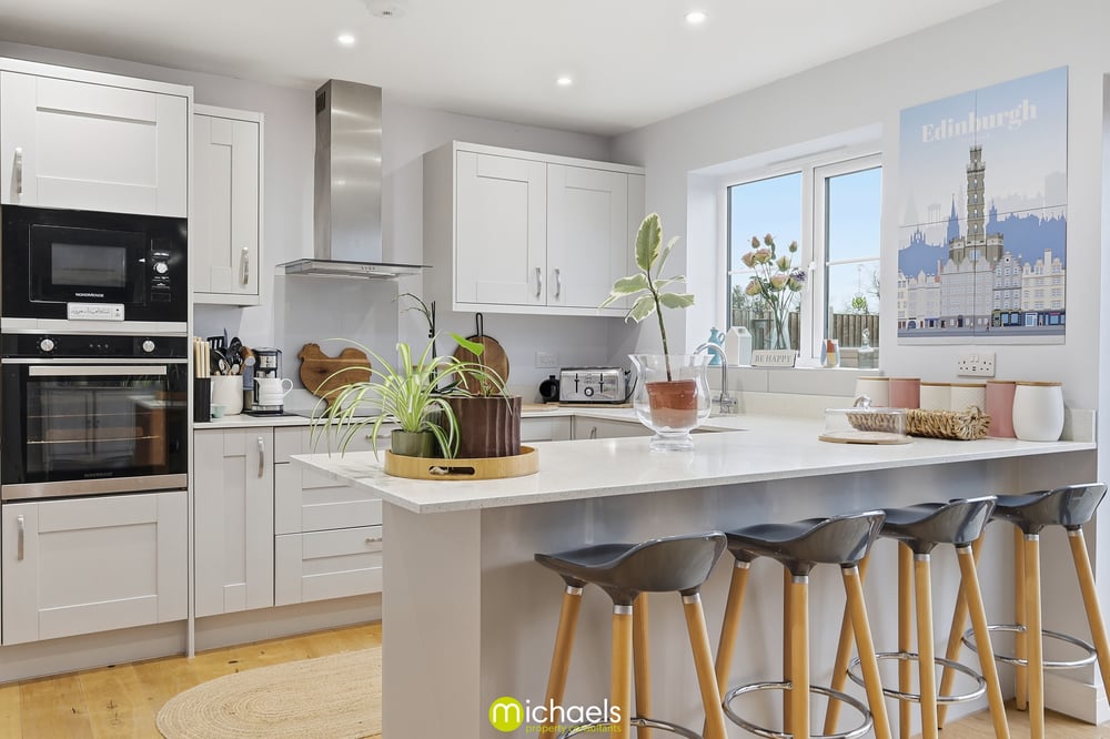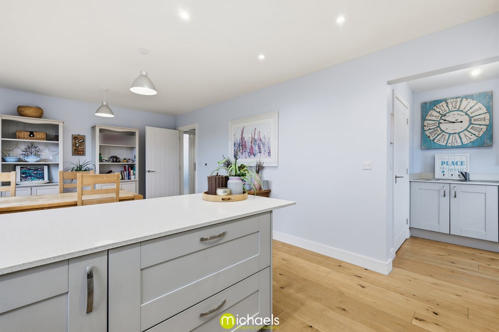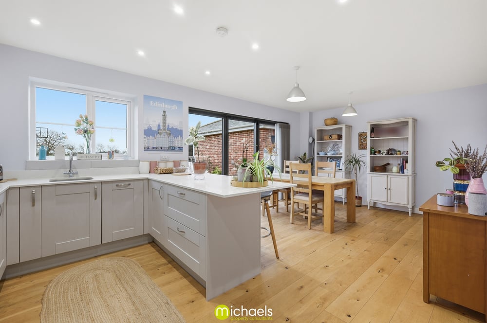 21' 0" x 12' 0" (6.40m x 3.66m) Bi-Fold to rear leading to garden, window to rear, engineered Oak flooring with heating under, a stylish range of fitted units and drawers with stone worktops over, undermount sink with mixer tap, inset induction hob with extractor over, fitted oven, fitted microwave, integrated fridge/freezer, integrated dishwasher, breakfast bar area with space for seating. Open plan to: