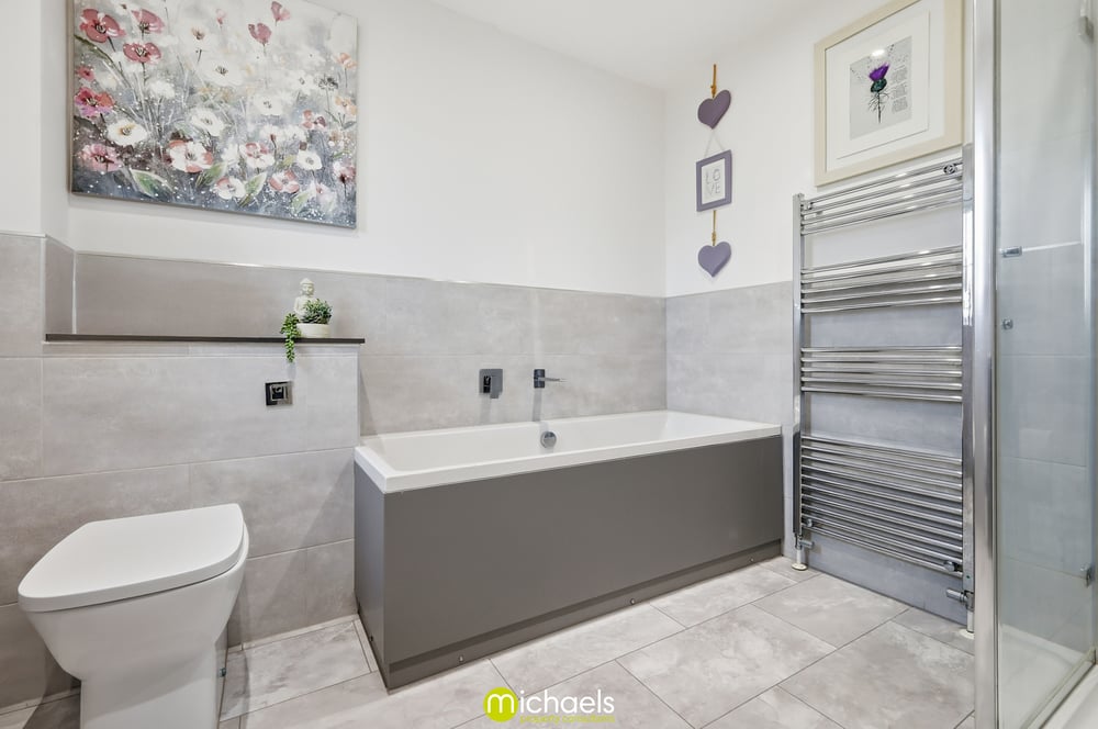 Obscure window to side, panel bath, shower cubicle, enclosed cistern WC, heated towel rail, tiled floor, half tiled walls.