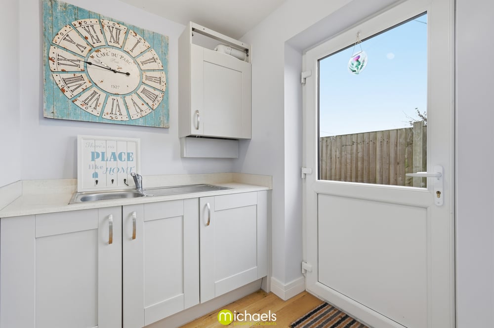 6' 5" x 5' 2" (1.96m x 1.57m) Half glazed door leading to garden, engineered Oak flooring with heating under, fitted units with inset sink, integrated washing machine, door to: