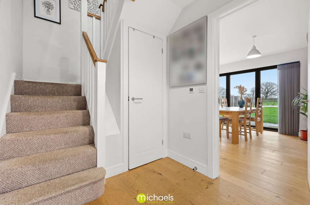 Engineered Oak flooring with heating under, stairs rising to first floor, storage cupboard and doors leading to: