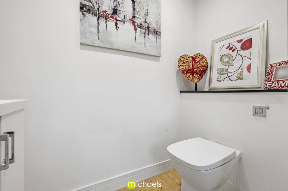 Engineered Oak flooring with heating under, enclosed cistern WC, vanity wash hand basin.