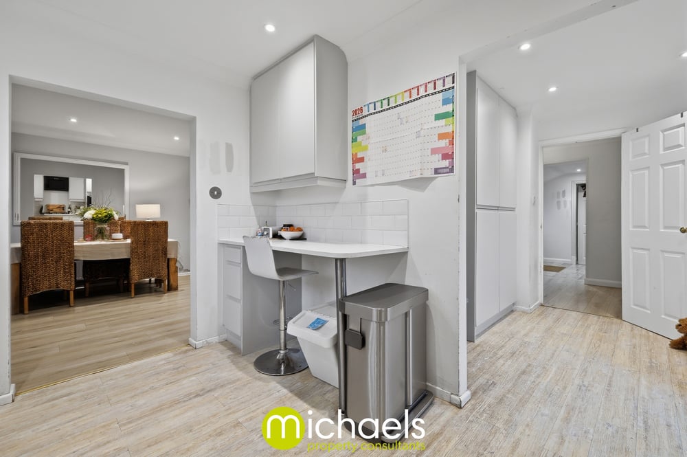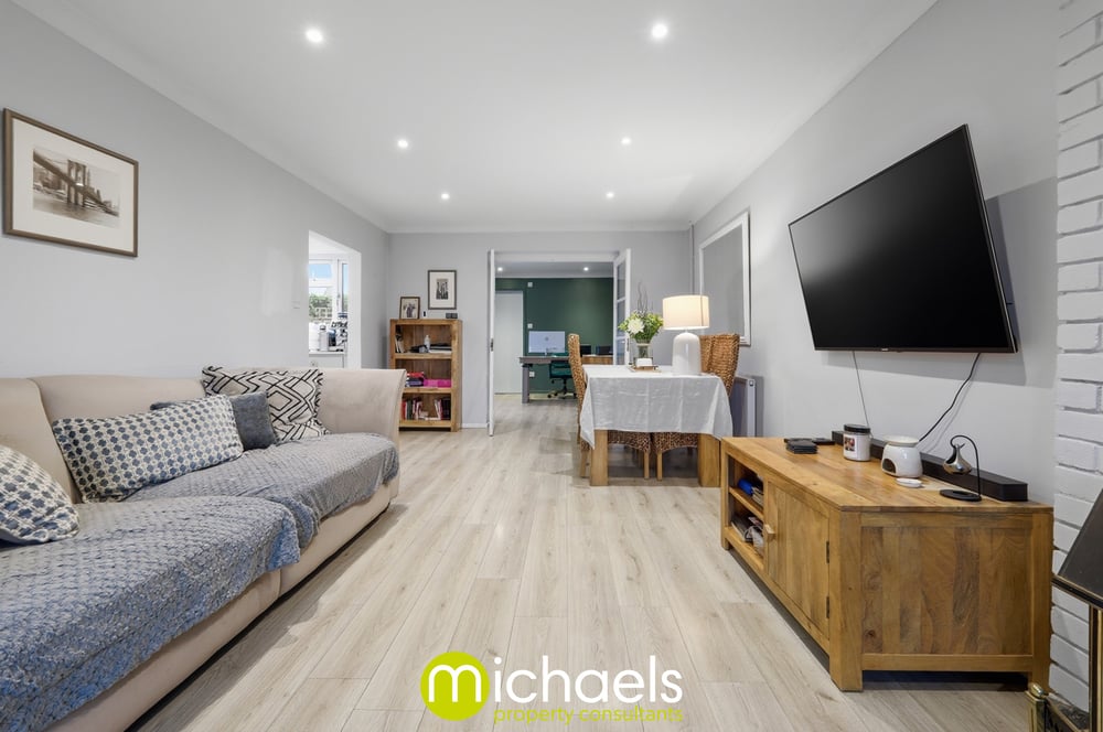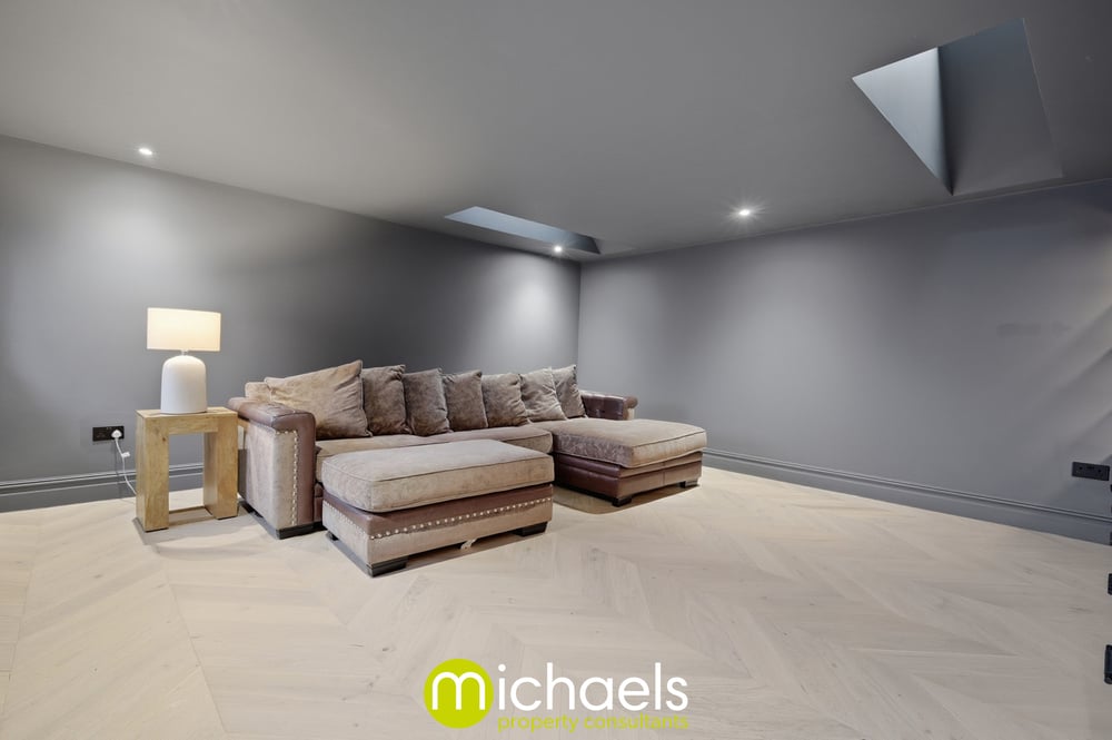 Upon entering, a welcoming entrance hall with modern LVT flooring provides access to the first floor and a convenient downstairs cloakroom. An impressive family room, created through a tasteful garage conversion, offers a warm and calming atmosphere. Currently used as a TV room with a bespoke media unit, this versatile space would also suit a home office, therapy room, or playroom.