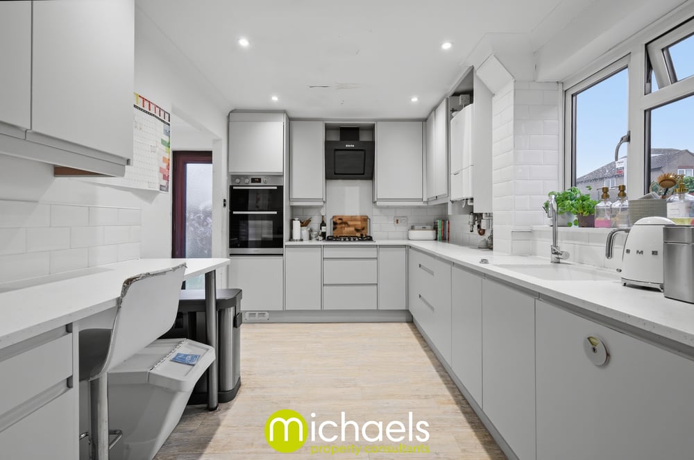 A spacious reception room provides an ideal setting for entertaining and hosting, seamlessly flowing through to the modern kitchen. The kitchen features high-gloss units, a breakfast bar, integrated appliances, and tiled walls. Additional luxury is offered by the utility room, which provides side access and space and plumbing for appliances.