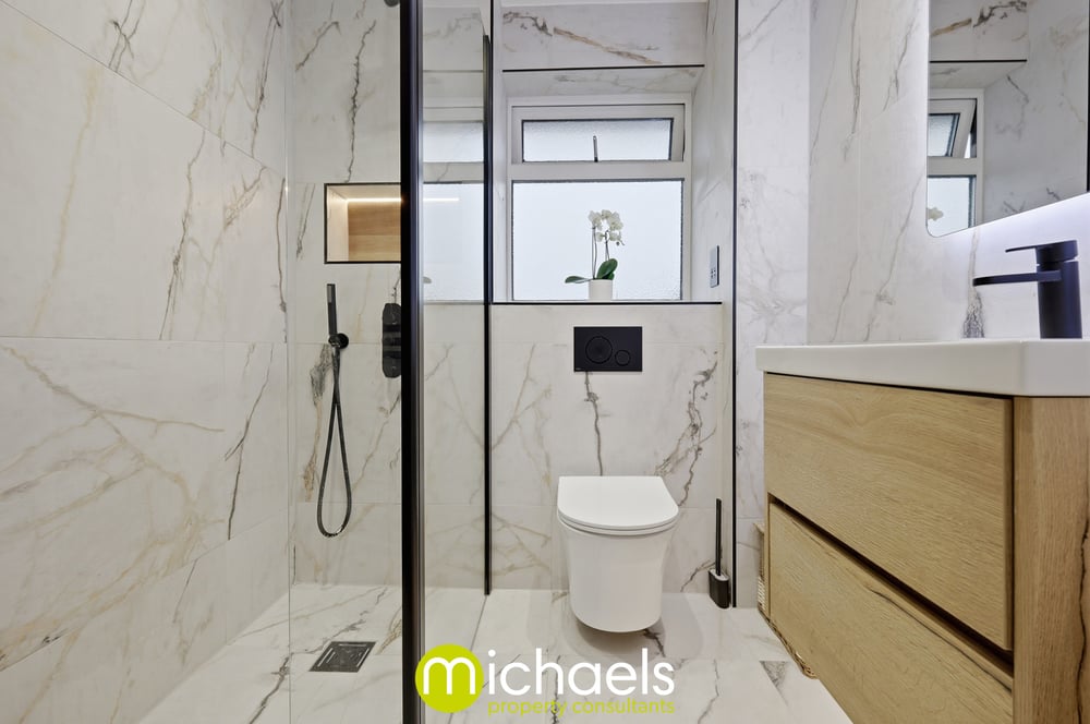 The first floor comprises four well-proportioned bedrooms, including a principal bedroom with en-suite shower room finished in a stylish monochrome design, along with a family bathroom.