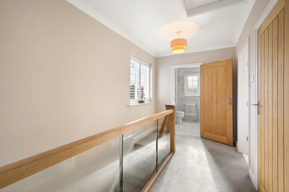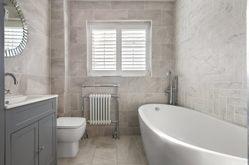 Double glazed window to rear with bespoke shutter, tiled floor and walls, vanity unit, WC, free standing bath and taps, radiator, towel radiator.