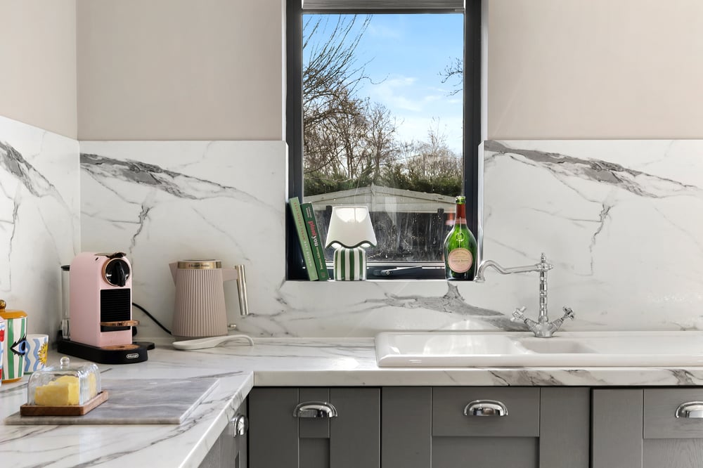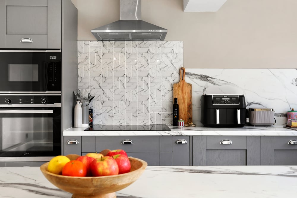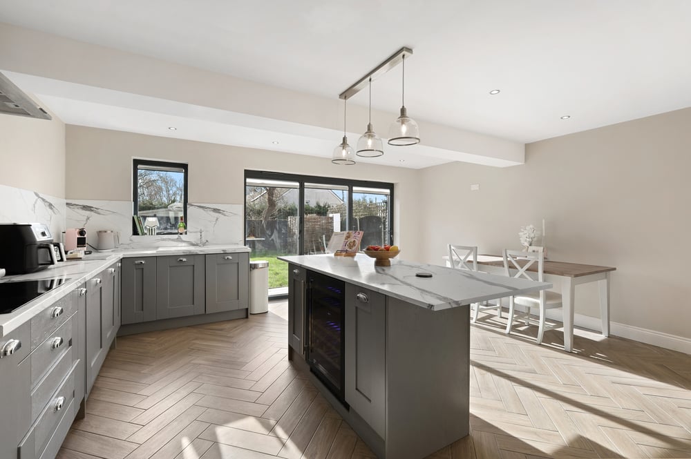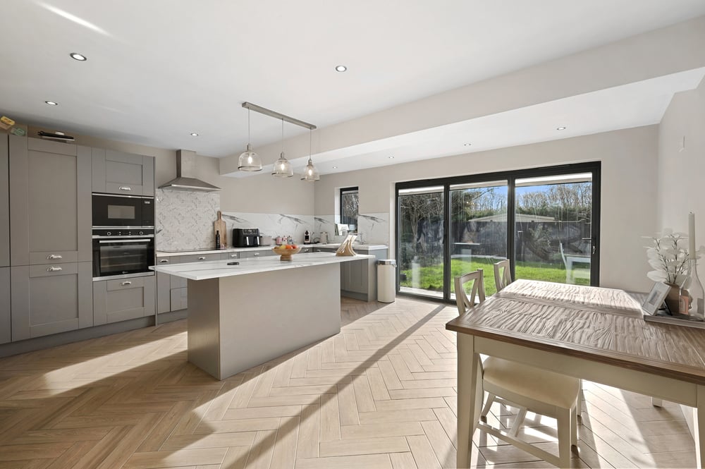 19' 1" x 17' 0" (5.82m x 5.18m) Double glazed window a bi-folding doors to rear looking onto the garden, inset spot lights, a fitted kitchen including a range of shaker style wall and base level units, island creating breakfast bar, sink, induction hob with tiled splash back, cooker hood, double oven, dish washer, fridge/ freezer. Open plan onto the dining area.